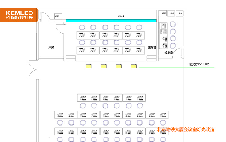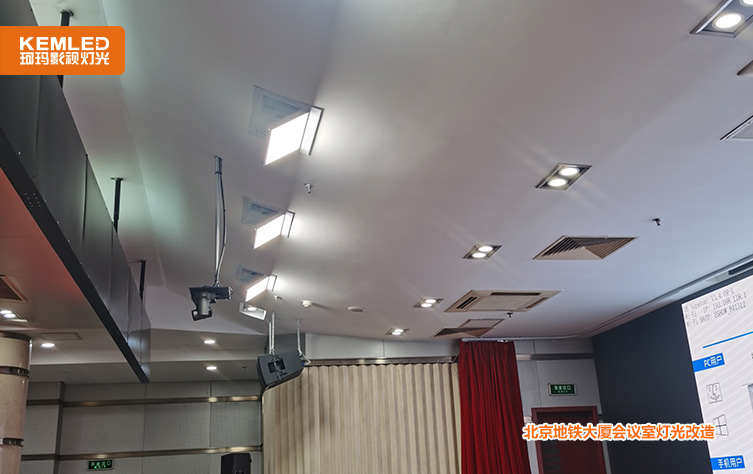 珂玛工程师陈志林勘察过现场之后,使用4台电动翻转LED平板灯,型号KM-H12,替换掉原来在舞台前方的筒灯。 KM-H12平板灯的发光面角度可以在0-65度任意调节,让脸部均匀照亮。功率120W,光效高,非常适用层高4米以下会议室,给主席台补充面光。此外,这款灯具的显色指数97以上,色彩的还原度高,能达到非常舒适的视觉效果;灯具的色温是连续可调的,可以根据现场开会的环境,调节灯具色温,从3200K暖黄光到5600K冷白光任意调节。