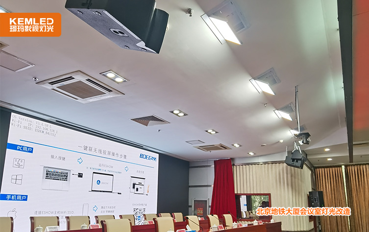 主席台为重点照明的区域,原来舞台上方安装常见的筒灯作为基础的照明,后来因为会议室升级,主席台的背景安装了电子大屏,导致拍摄区域的背景过于明亮,而原有的筒灯无法满足现场的照度要求,导致没有面光,拍摄画面中领导面部偏黑、看不清楚。