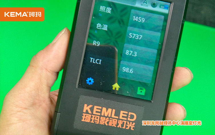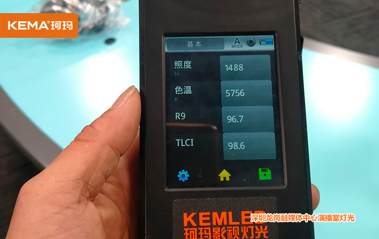 安装完毕之后,我们现场进行测试,照度1488Lx,色温5756,显色指数R9饱和红色为96.7,TLCI指数98.6,拍摄高清,画面真实,抠像无虚边,主持人面部无阴影,灯光效果满足广电级4K超高清演播室灯光设计标准。