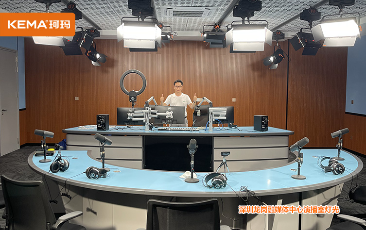 深圳龙岗区融媒体中心演播室面积130平左右,有2个景区,一个为实景景区,做电台直播间,一个为虚拟绿箱,项目要求照度和色温满足国家广电部推荐标准,并且灯光设计要满足4K超高清电视节目的制作要求。