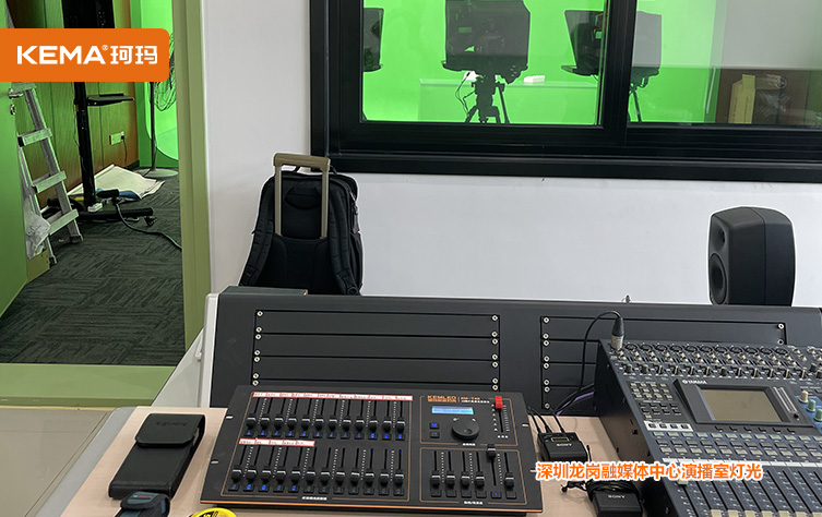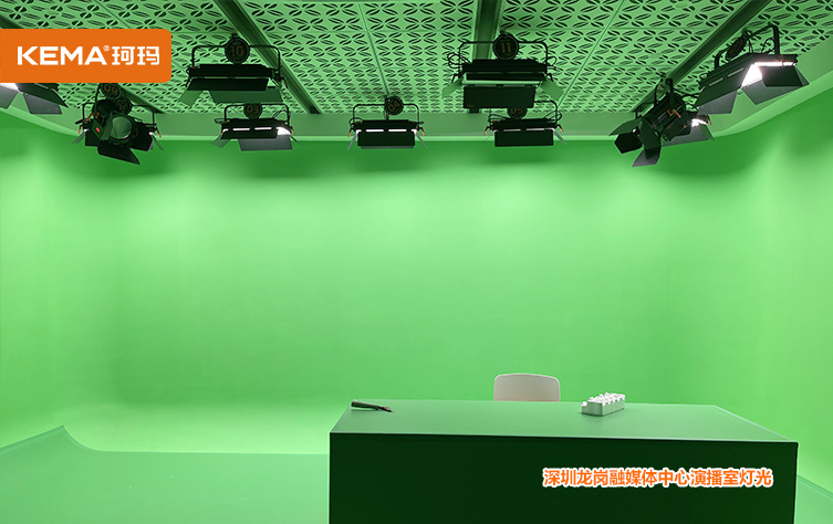 深圳龙岗融媒体中心演播室是一个4K超高清演播室,由武汉珂玛提供灯光的设计、安装、调试一站式服务,房间层高3.6米,共设计39台灯具,采用挂灯支架将灯具安装到房间实顶之上,支架穿过顶部装饰网吊顶,保证灯光效果的同时,也保证演播室吊顶整体的美观度,控制方式采用KM-T48/48通道DMX512调光台控制灯具。