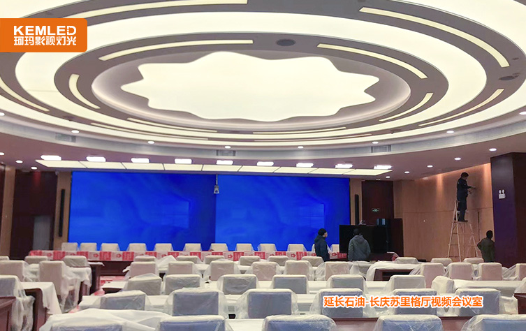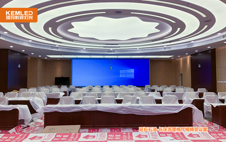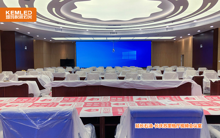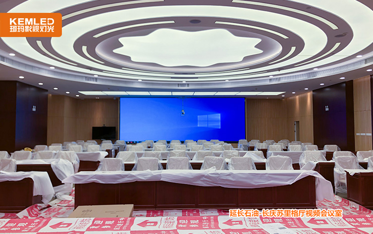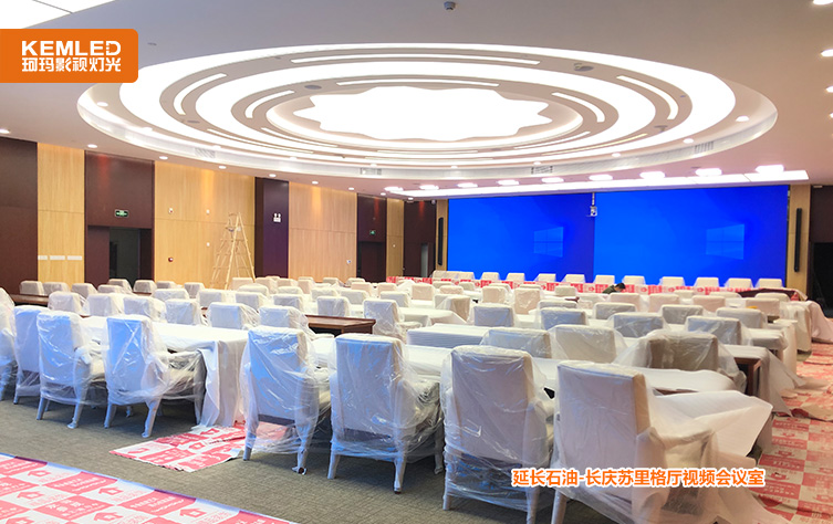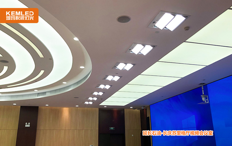陕西延长石油集团公司长庆苏里格厅会议室原来是找的装修公司安装的民用灯光,整个房间看着挺亮,平常开会的时候照度基本是够的,但是在开视频会议室时,尤其是背景大屏打开之后,摄像头拍摄到的画面几乎是黑的,面部几乎无法看清。