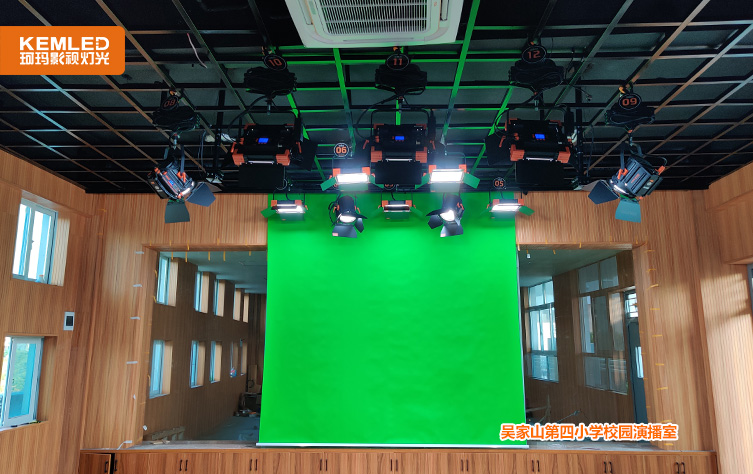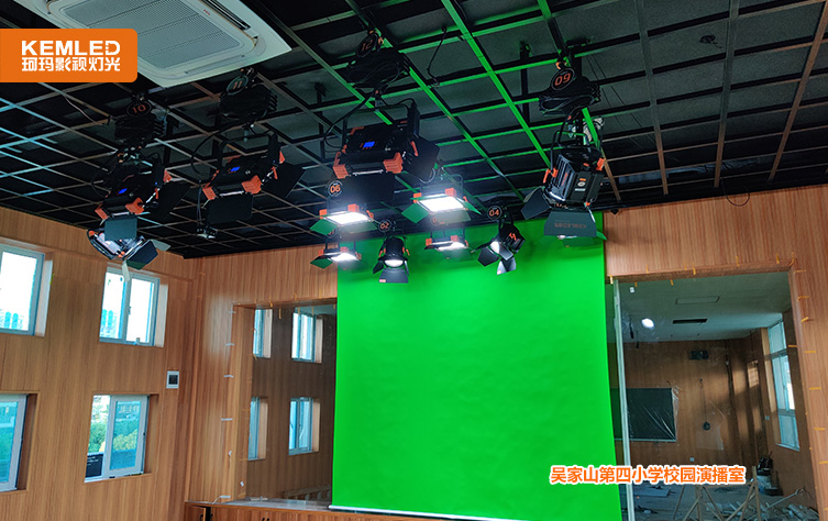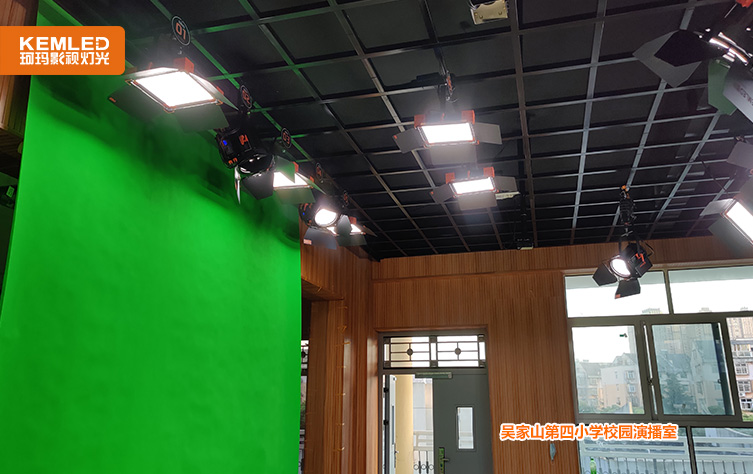 吴家山第四小学演播室房间总面积约74㎡(长10.5米、宽7.3米、高3.2米),房间层高在3.2米,满足灯具使用葡萄架安装的条件,必须还能随意调整灯具位置,起到方便后期调光和修饰房顶的作用。灯具设计方面,我们珂玛灯光是结合自身多年的工作经验,给出了如下灯光设计方案:人物的背景光、顶光、侧光和面光选择使用8台KM-S6LED演播室平板柔光灯进行布光;人物的面聚光和轮廓光使用4台KM-M7LED演播室聚光灯。学生区域搭配9台KM-LB312超博面板灯,柔光防眩,高频无闪烁特点,提供演播室护眼照明。