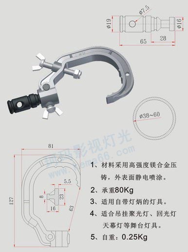 1. 灯钩,是吊挂灯具的一个钩体,有铝合金和铸钢两种材质,根据吊挂的重量不同,设计时会有不同大小承重的灯钩,一般用在新闻演播室灯光的灯具,都在20KG以内,被钩的结构也都是30,40,50方管或者圆管,因此一种灯钩是满足演播室灯光的需求的;