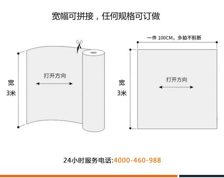 4.使用方法:幕布原材料标准宽3米,50米长,根据需求尺寸做定制,第一种:直接封边,第二种:四周打孔;