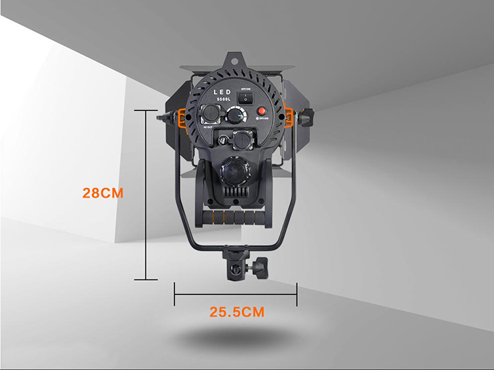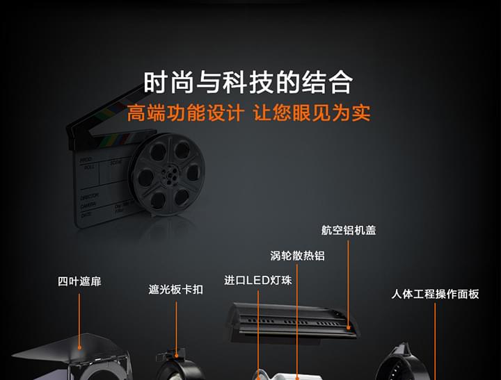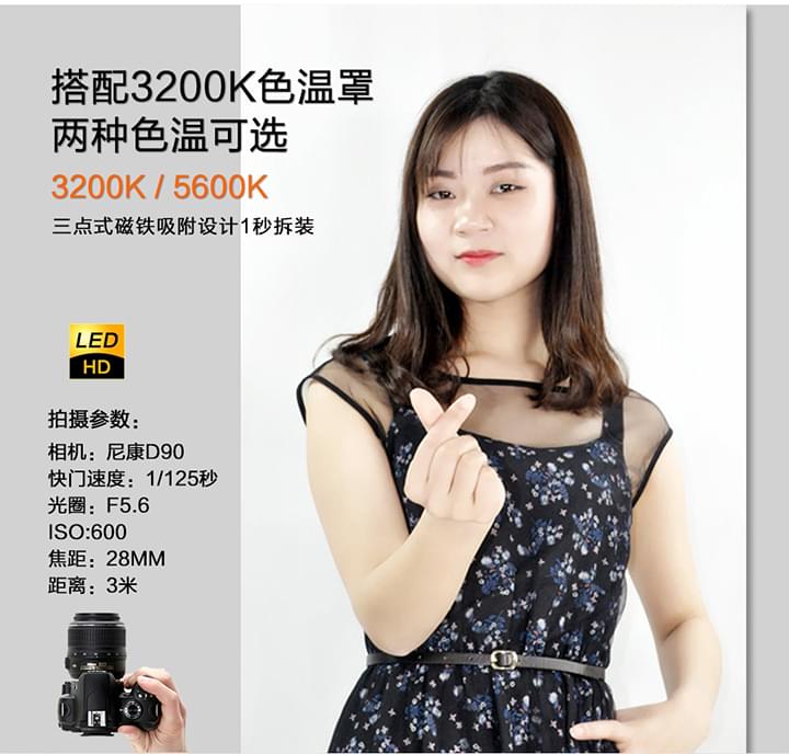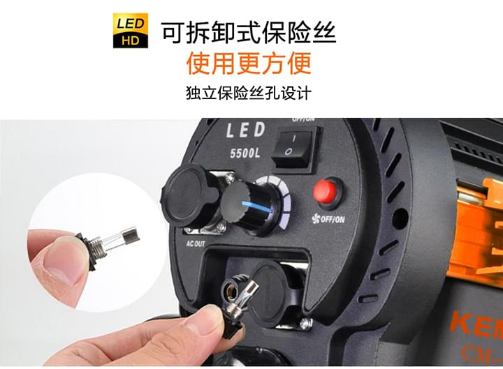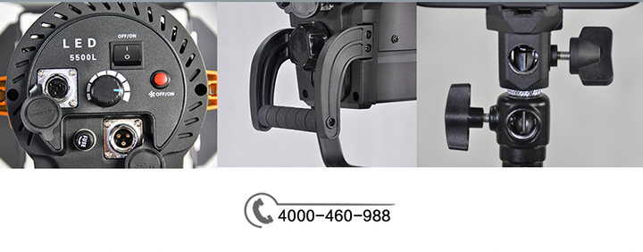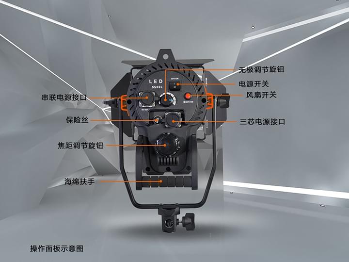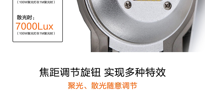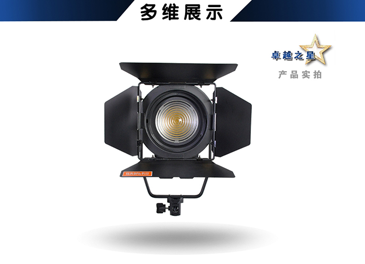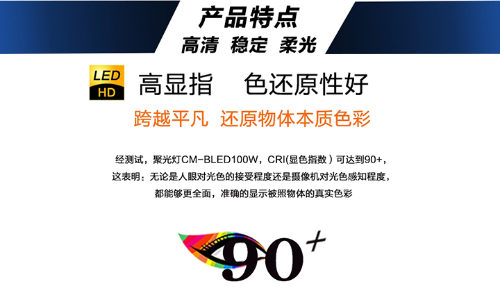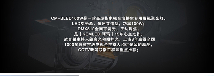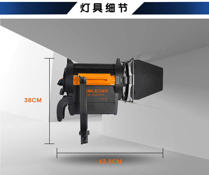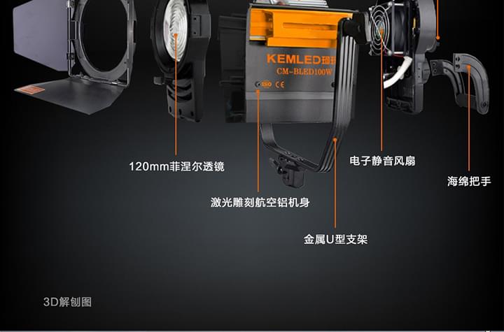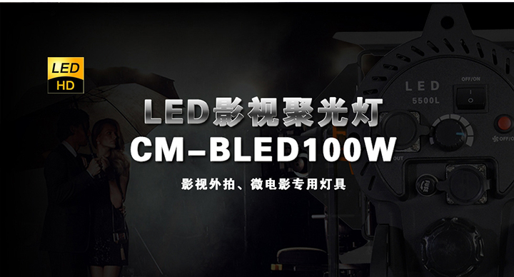 珂玛CM-BLED100W便携式聚光灯,相当于镝灯575W照度,代替传统镝灯,无需镇流器电子牛,随时开关启动,调节亮度0%-100%,主机手动旋钮调光。采用金属外壳,外形精致,结构轻巧,便于携带,结构结实,具有良好的散热性;没有钨丝,玻壳等容易损坏的部件,轻便,维护费用和使用成本低,柔光板磁铁吸合式设计,不易掉落,方便取下,无温度;由于光谱中没有紫外线和红外线,故没有热量,没有辐射,是典型的绿色环保照明光源。适用于影视移动外拍、拍电影、拍电视、拍广告、拍专题片、人物专访、影楼等需要专业拍摄的场合。