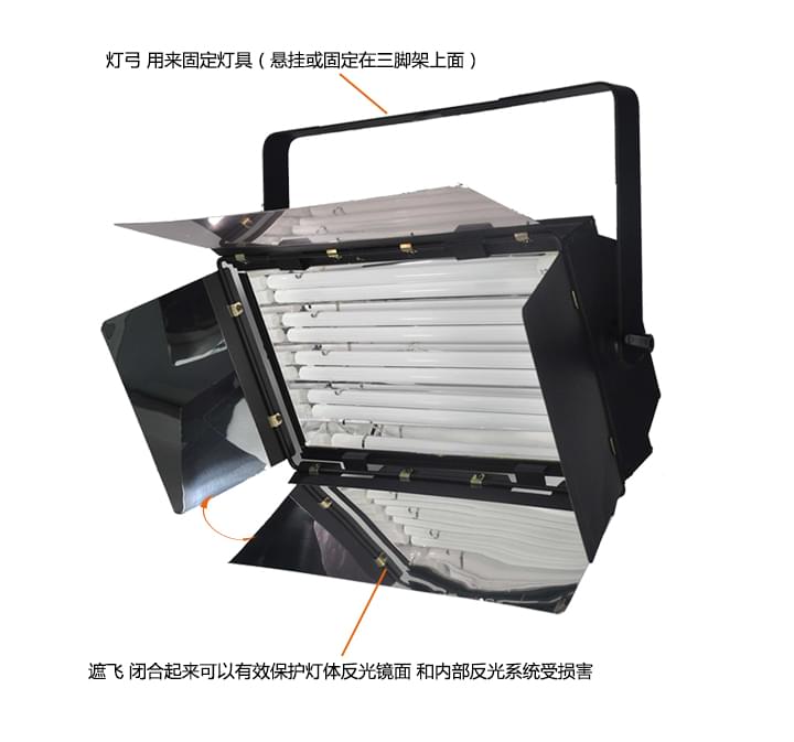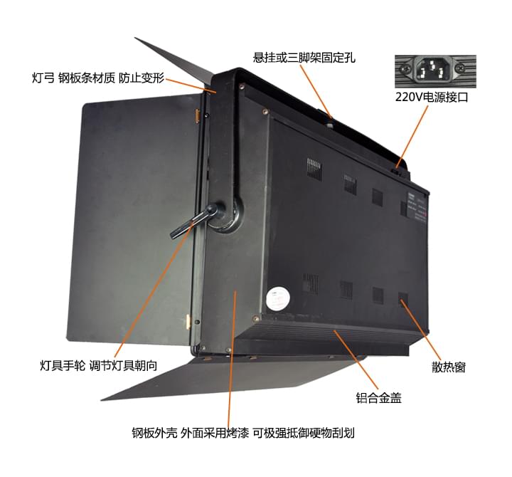 注:该系列灯具如果采用外挂方式需对房间的高度要求不低于2.7米,才能使用该灯具布光,对配电负荷,空调配备,悬挂系统均无特殊的要求。也可使用三脚架随时携带,作为移动灯具使用。